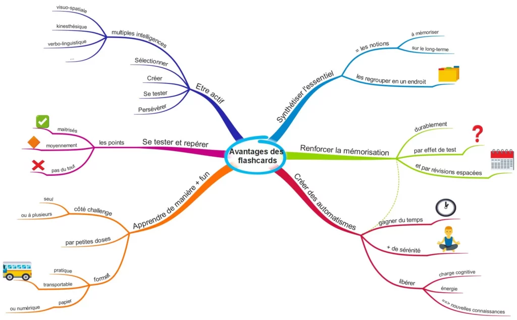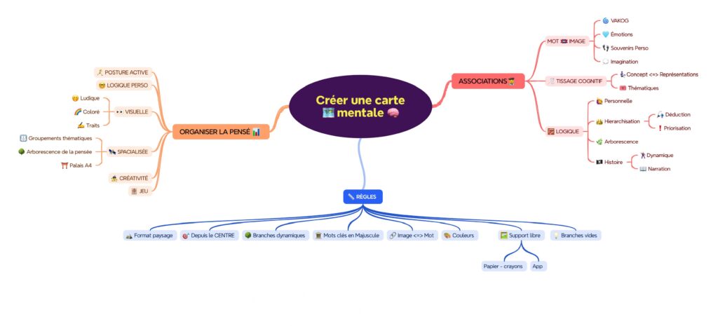 L’exemple le plus connu et l’un des plus fonctionnels est celui de la carte mentale. Pour vous partager cette méthode, je vous l’ai illustrée sous la forme d’une carte mentale. Celle-ci mériterait d’être enrichie d’un plus grand nombre d’images mais la base est là.